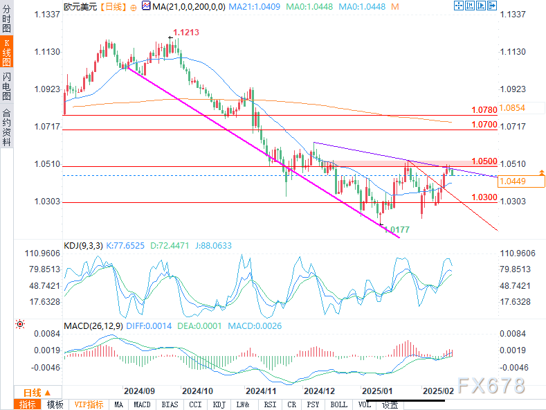 周二(2月18日)欧盘时段,欧元/美元盘中走跌。欧元/美元在周一回落至1.05下方后,仍略显疲弱。此前一周,因市场对俄乌冲突可能结束持乐观态度,欧元/美元出现反弹。尽管该货币对并未大幅下跌,但至少可以说,上行缺乏后续动力一定让多头感到沮丧。无论如何,鉴于乌克兰问题谈判仍在继续,短期内下行空间应有限。如果俄罗斯和乌克兰最终达成和平协议,美元很可能面临新一轮回调。然而,目前市场缺乏对美元的明确看跌因素,这使得美元随债券收益率有所回升。尽管如此,欧元/美元的短期前景已有所改善,我认为该货币对目前上行风险加大,预计未来几天仍将升至1.05上方。