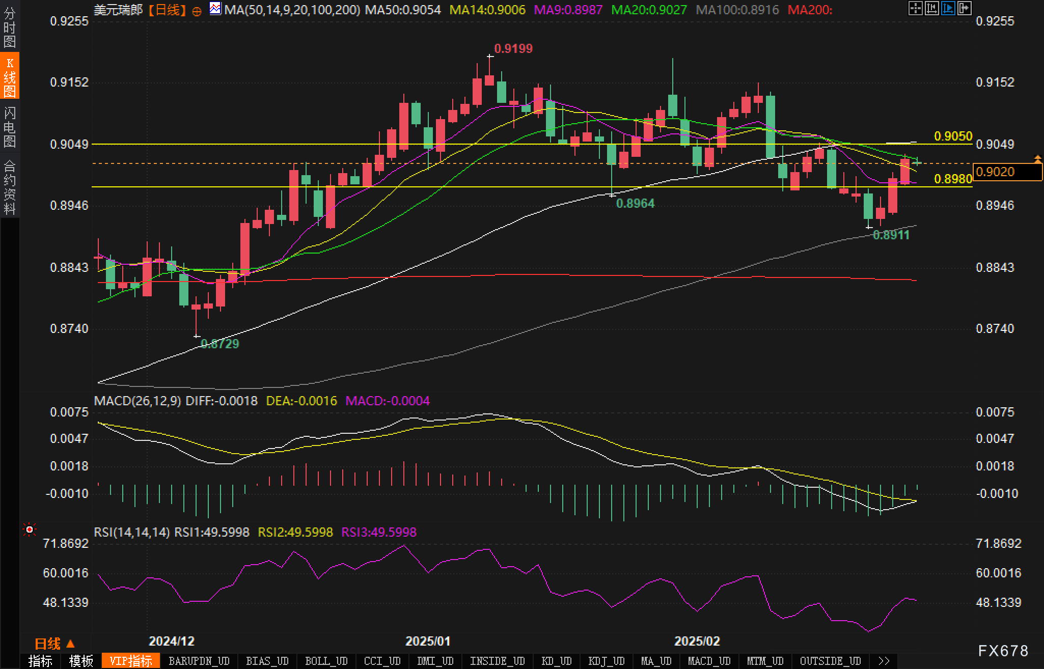 从技术面图表分析来看,美元兑瑞郎日线级别走势相对复杂,但呈现出明显的空头信号。从均线系统观察,当前汇价受到上方50日移动平均线(MA50)压制,该均线位于0.9054,短线为重要阻力位。在汇价近期几次尝试上破MA50未果后,明显回落,说明卖压较大,多头反弹力量有限。
