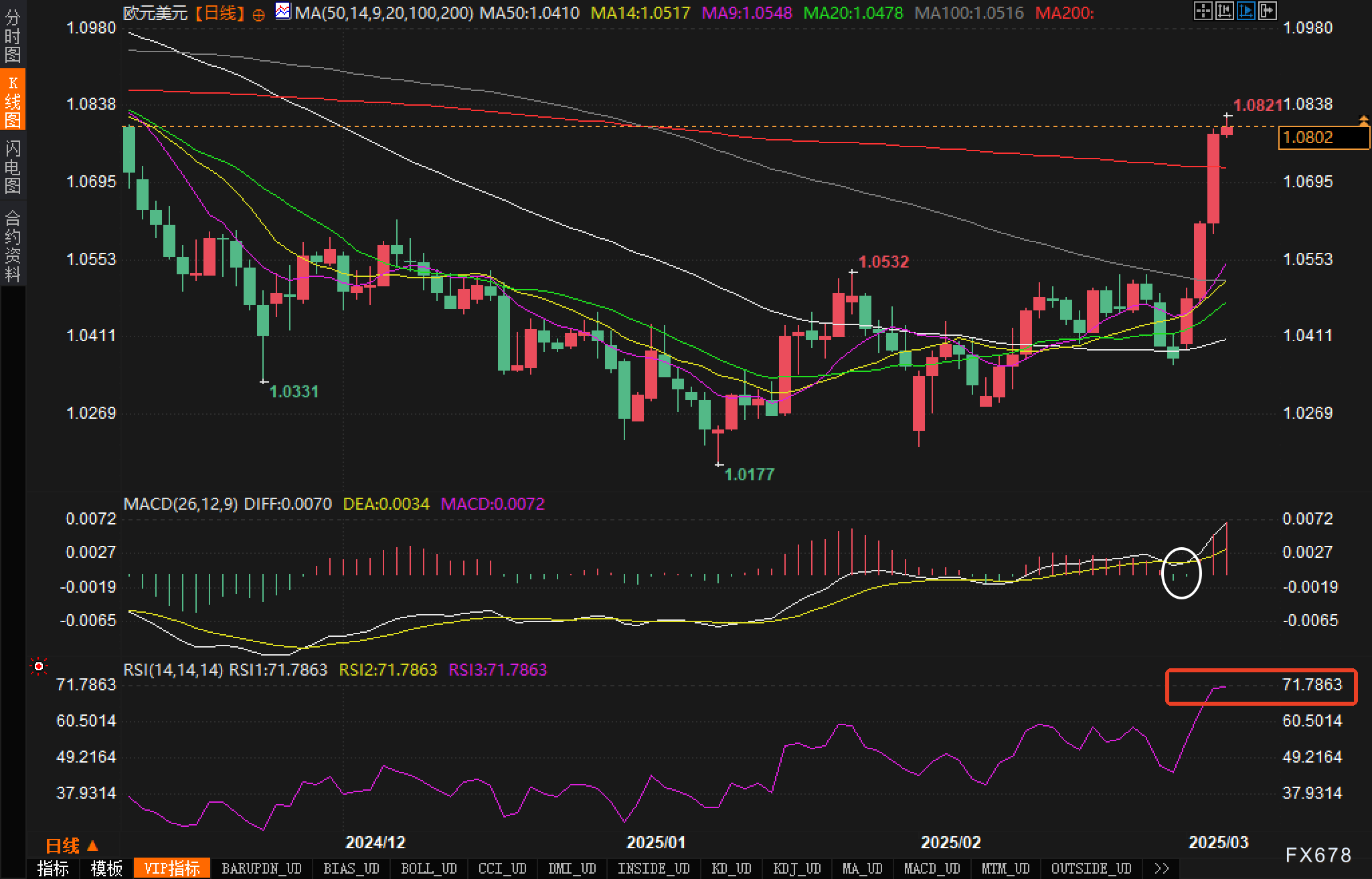 周四(3月6日)欧洲交易时段,欧元/美元在连续三个交易日强势拉升后,到达1.08上方,引发市场广泛关注。这波凌厉涨势的触发因素主要来自欧洲内部政策环境的潜在转变,以及美国在对外经贸关系上采取的强硬举措所带来的市场情绪波动。