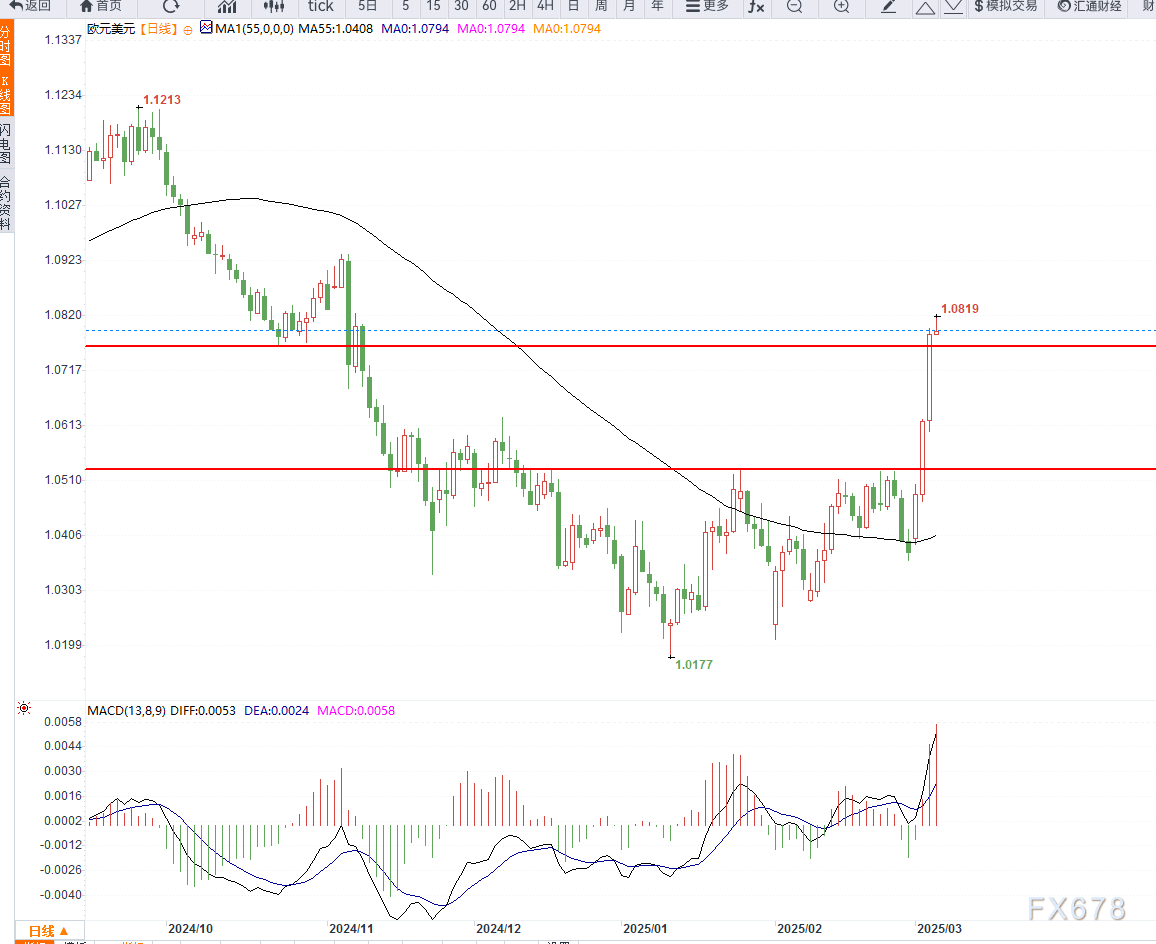 欧元在过去三天内累计上涨1.5%,达到1.0800美元附近,创下自2015年8月以来的最强三日涨势。德国政府宣布计划投入数千亿欧元用于国防和基础设施建设,这一消息刺激欧元大幅上涨。