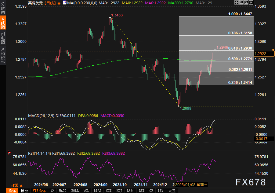 从技术面来看,英镑兑美元当前报价1.2925,日内涨幅0.39%,显示多头在日内低点企稳后迅速发力。盘中走势显示,13:30至17:00的加速上涨伴随着成交量放大,随后在1.2930附近高位震荡,反映市场追涨意愿有所增强。这一水平恰好对应从去年9月末高点至今年1月中旬低点的61.8%斐波那契回撤位,突破与否将成为短期方向的关键。