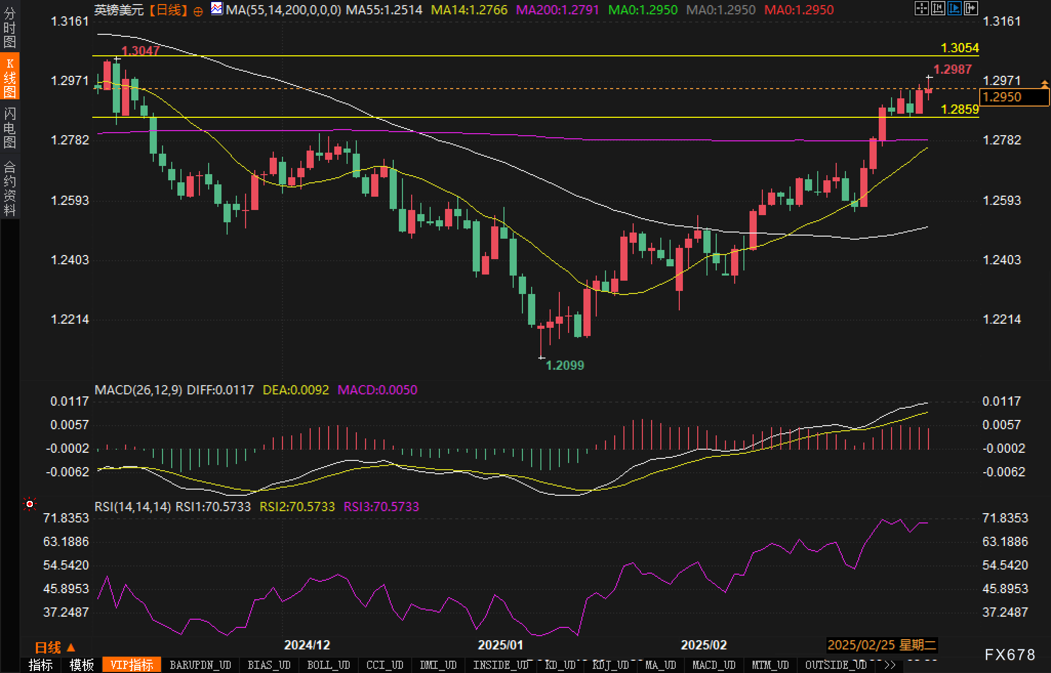 日线图的MACD指标表现积极,柱状体虽有所缩短但仍位于零轴上方,显示多头趋势尚未结束,短期修整属于正常现象。RSI指标则已接近超买区域(约70.50),提示市场短期可能进入震荡修整阶段。因此短期内多头如若持续冲高,仍需关注1.2987-1.3000附近区域的阻力强度,若无法有效突破,不排除短线获利回吐,英镑/美元面临回调整理可能。