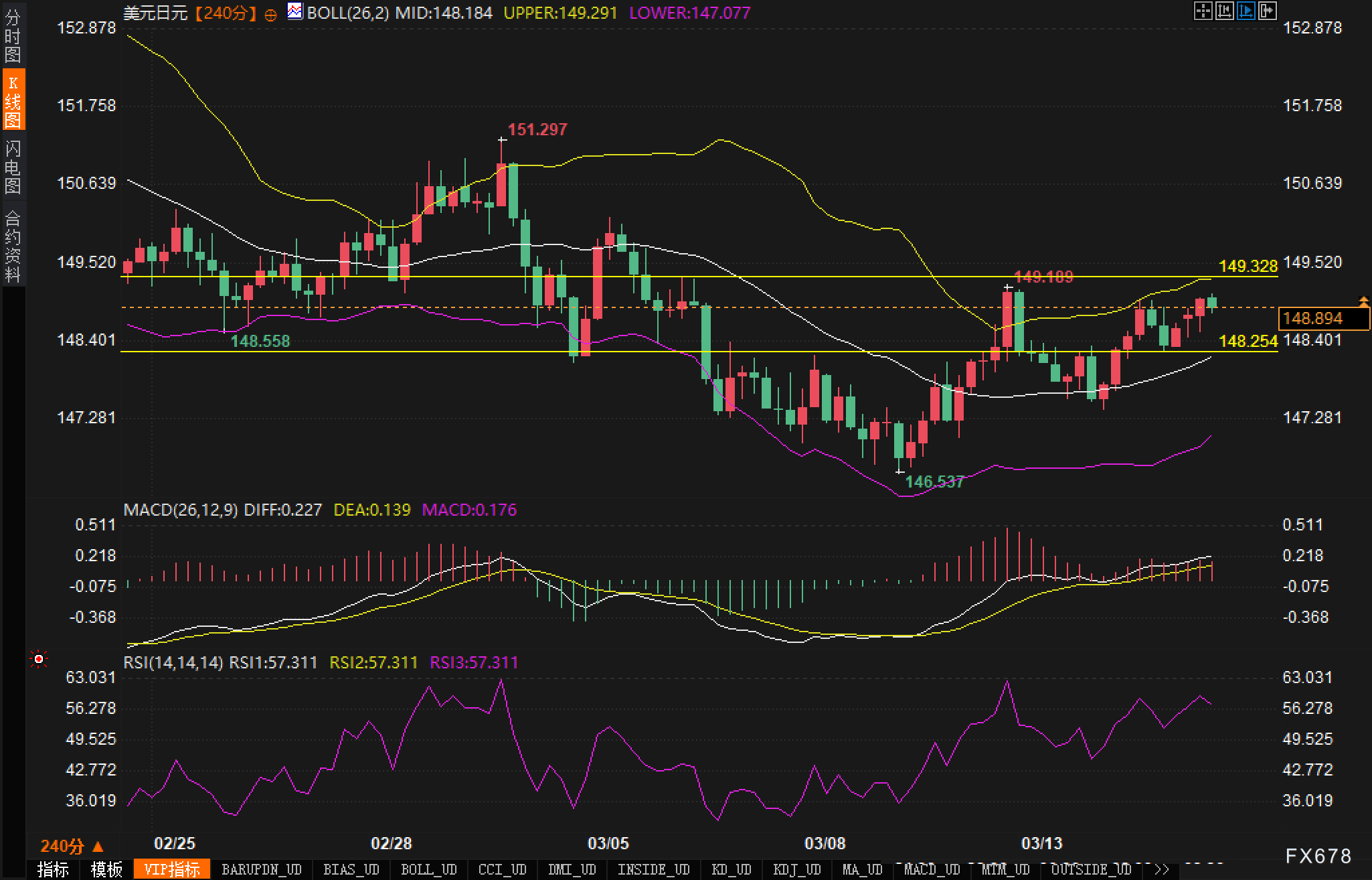 从4小时图来看,美元/日元目前在148.894附近盘整,期间形成多个小时间级别的支撑位于148.254和148.401。MACD在4小时图上呈现正值,RSI(14)读数为57.311,处于温和超买区域,表明短线偏强但需警惕回调风险。