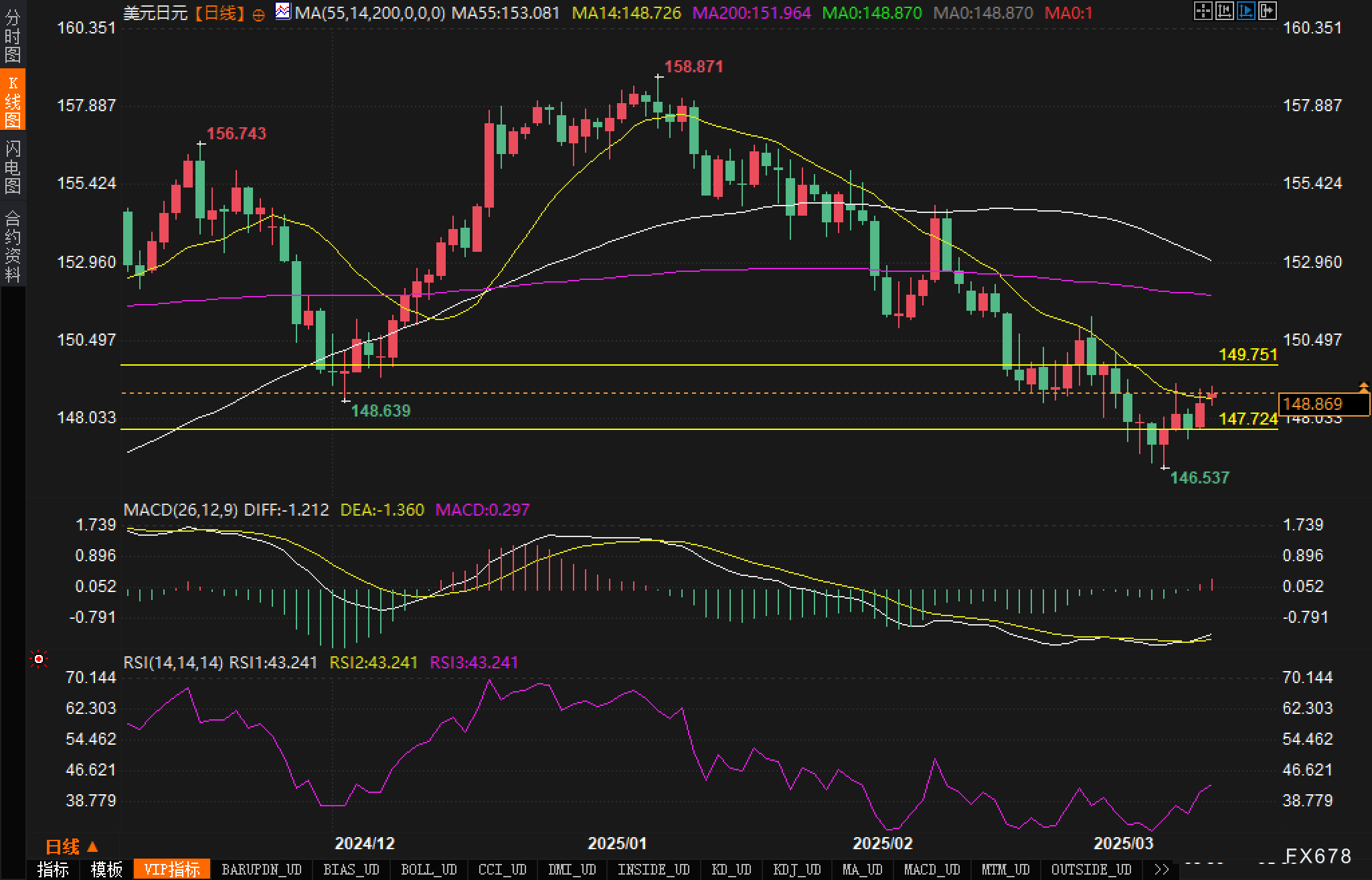 关键支撑位于147.724和146.537,后者是近期低点,也构成强劲支撑。若跌破146.537,则可能打开进一步下行空间,下一目标看向146.00整数关口。上方阻力位于149.751,若能有效突破149.751,则有望打开向151.297测试的通道。