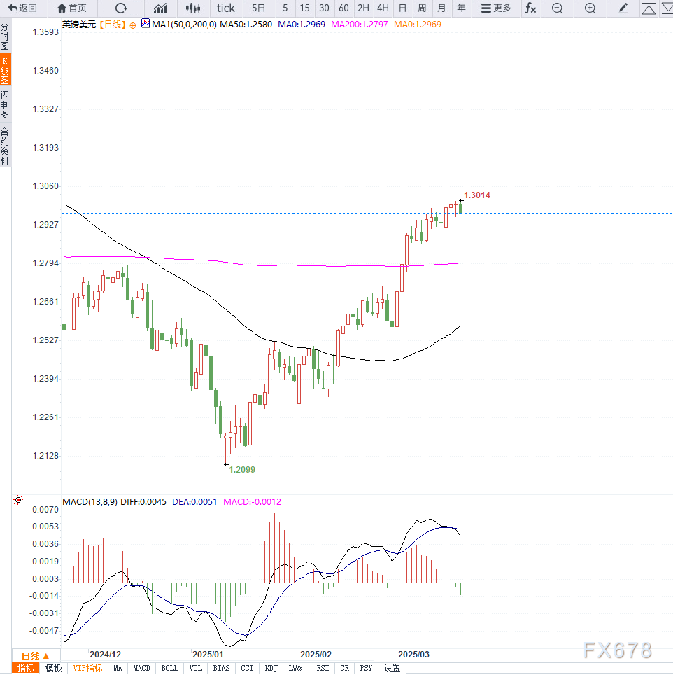 受英央行维持利率预期影响,英镑今日最高升至四个月高点1.3015美元,日内涨幅约0.3%。美元因美联储谨慎立场走软,为英镑提供了上行动力。然而,若贸易担忧情绪加剧,英镑的反弹可能受限。