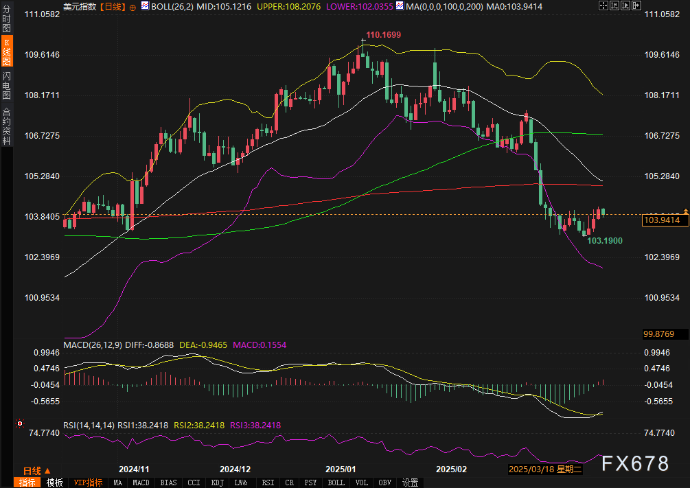 3月24日讯—— 周一(3月24日),美元指数(DXY)近期在104水平附近窄幅震荡,市场焦点集中在4月2日关税政策动向及关键经济数据的发布。尽管美国政府的关税言论加剧了避险情绪,但部分国家可能被豁免的消息缓和了市场紧张氛围,美元短期走势呈现多空拉锯态势。
