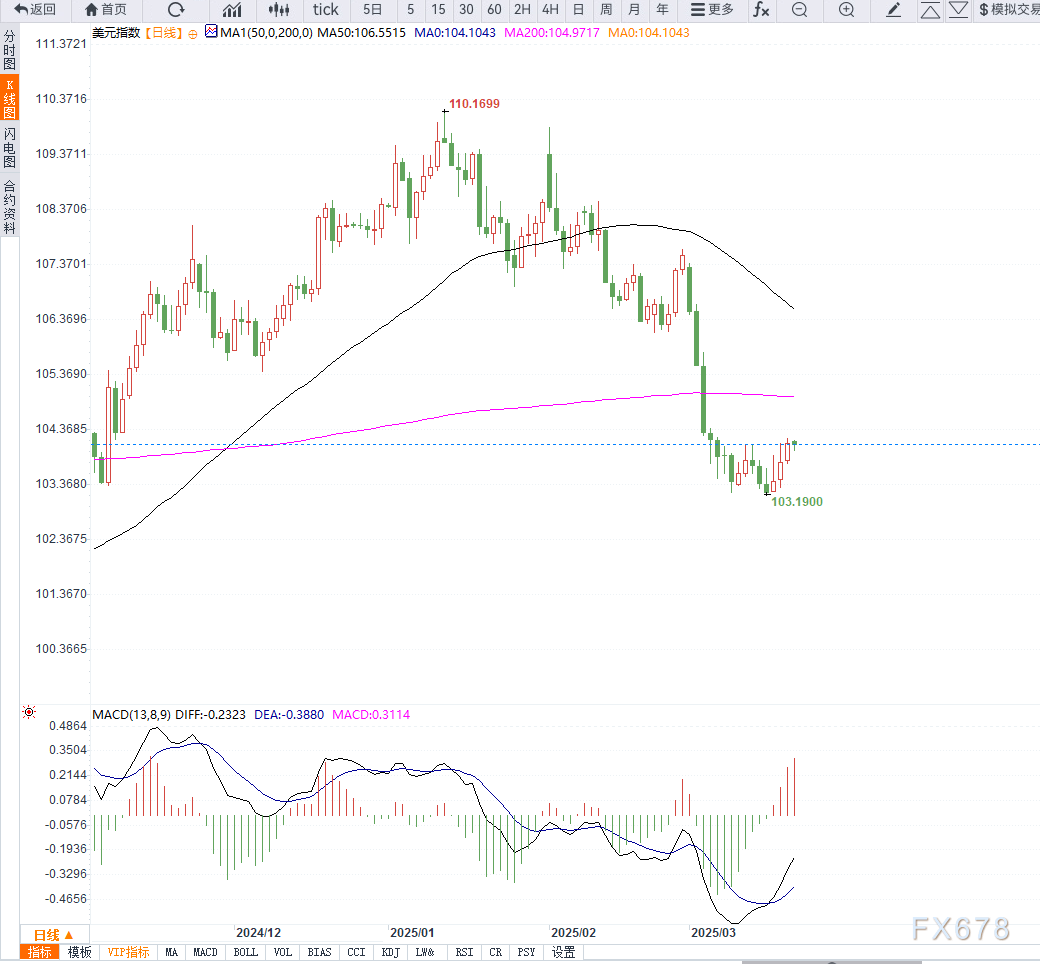 美元指数上周突破104关口,若关税政策温和且美国数据强劲,指数或升至105;若贸易摩擦升级引发衰退恐慌,可能回落至103。