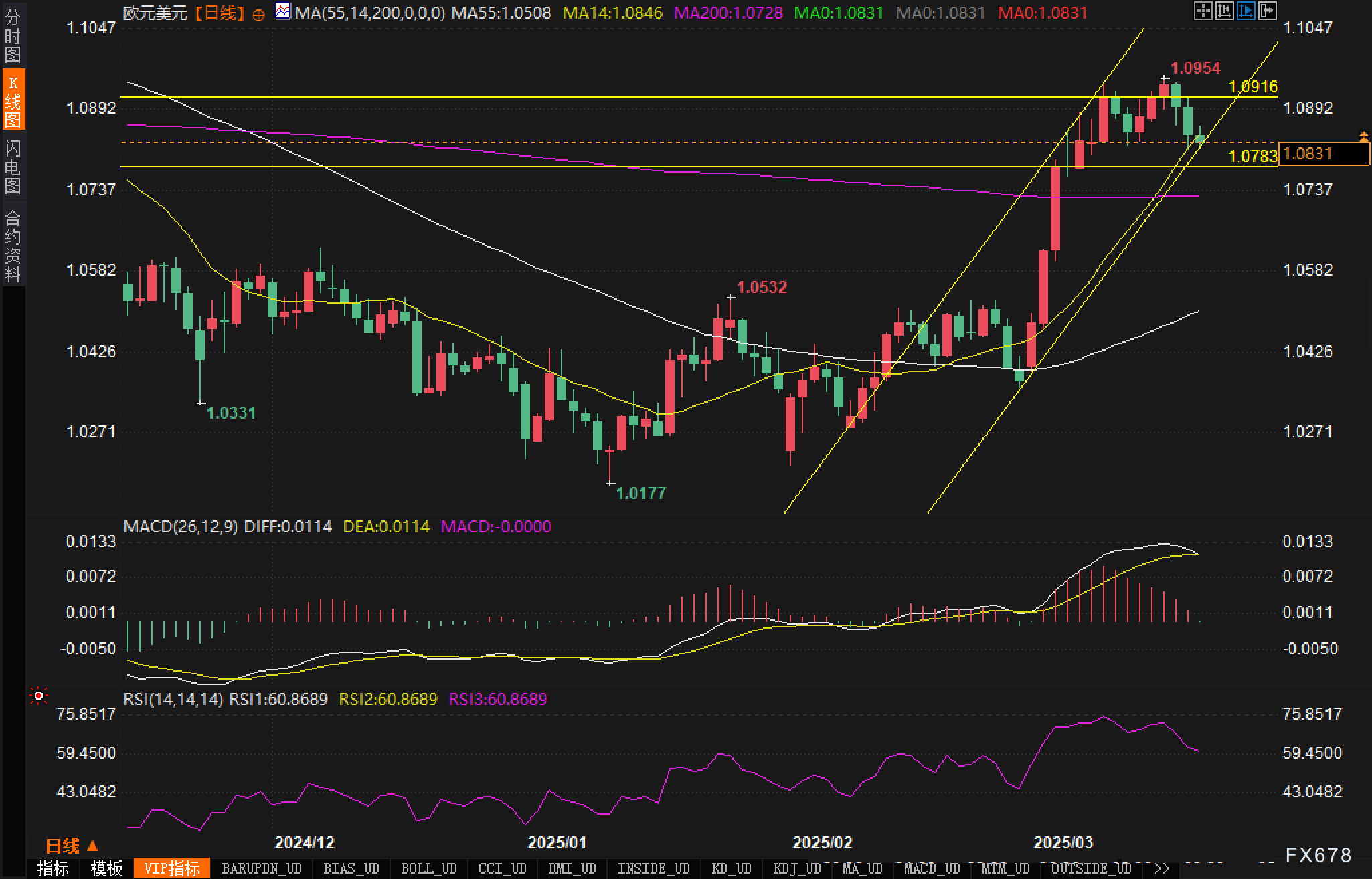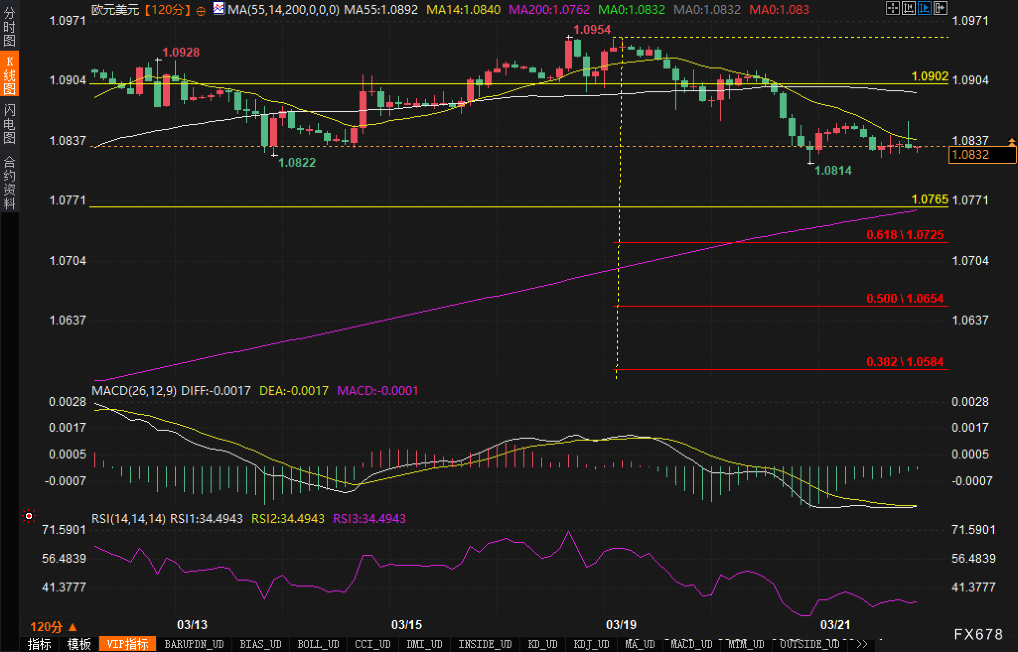 在120分钟图中,汇价先后触及1.0954与1.0814,展示近期的箱体震荡走弱格局。同时可以观察到,MA200(紫色)切入位于1.0762附近,且斐波那契回撤指标显示若后市延续调整,0.618回撤位1.0725和0.500回撤位1.0654依次构成潜在支撑。MACD在零轴下方保持绿柱,DEA与DIFF线持续走低,强化下行信号。若欧元无法在1.0814-1.0837区域企稳,二次探底风险犹存。此外,RSI在34一线挣扎说明动能偏弱,短线走势易受突发消息面影响而出现方向性突破。