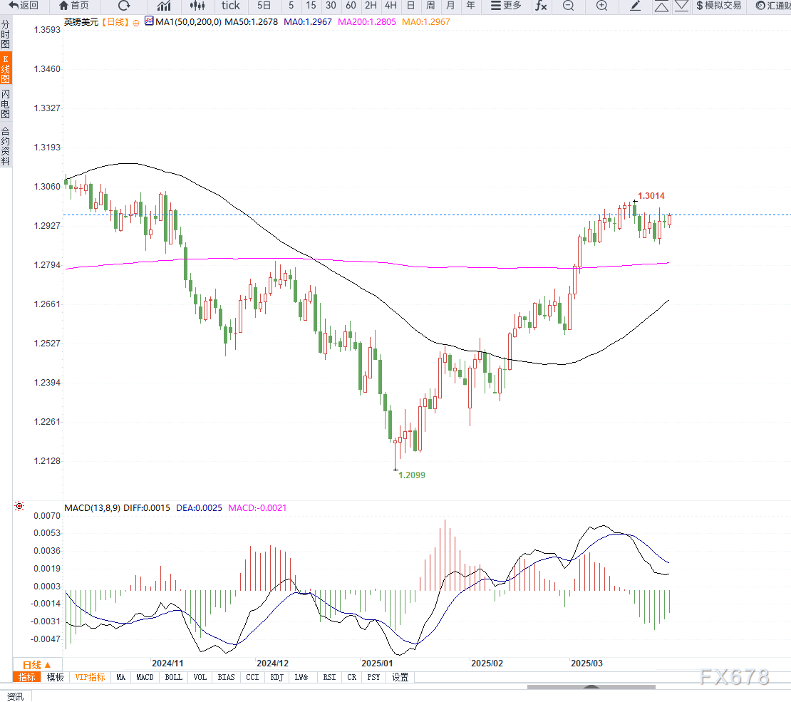从技术面来看,英镑兑美元(GBP/USD)短期内保持上行势头,当前接近1.2965的水平。若突破这一关键位置,可能会进一步测试1.3000的心理关口。随着美元的疲软,英镑可能会继续上涨,挑战更高的水平。
