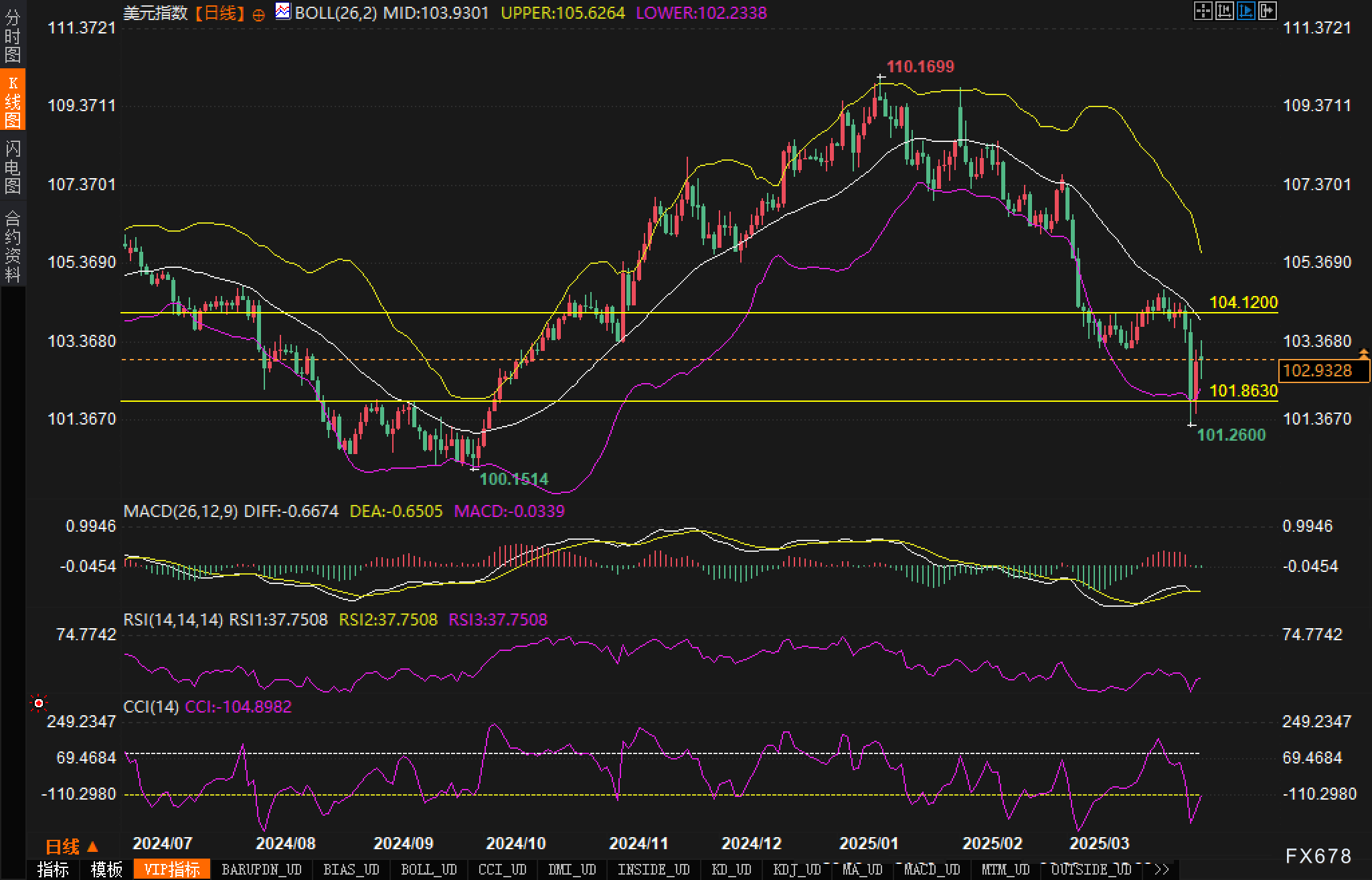 日线图技术形态则更为清晰地展现了美元指数的中期走势。自高点110.1699开始形成的下行趋势已经打破了重要的结构性支撑。目前价格在101.8630和104.1200之间震荡,形成关键的支撑与阻力区间。MACD指标在零轴下方运行,但差值(-0.6674)收窄,暗示空头力量可能趋于减弱。RSI指标处于37.7508的水平,处于中性偏弱状态,但尚未进入超卖区域。CCI指标跌至-104.8982,显示短期内仍有进一步下行的可能性。关键支撑位为101.2600,如果突破这一水平,或将测试100.1514的前期低点。