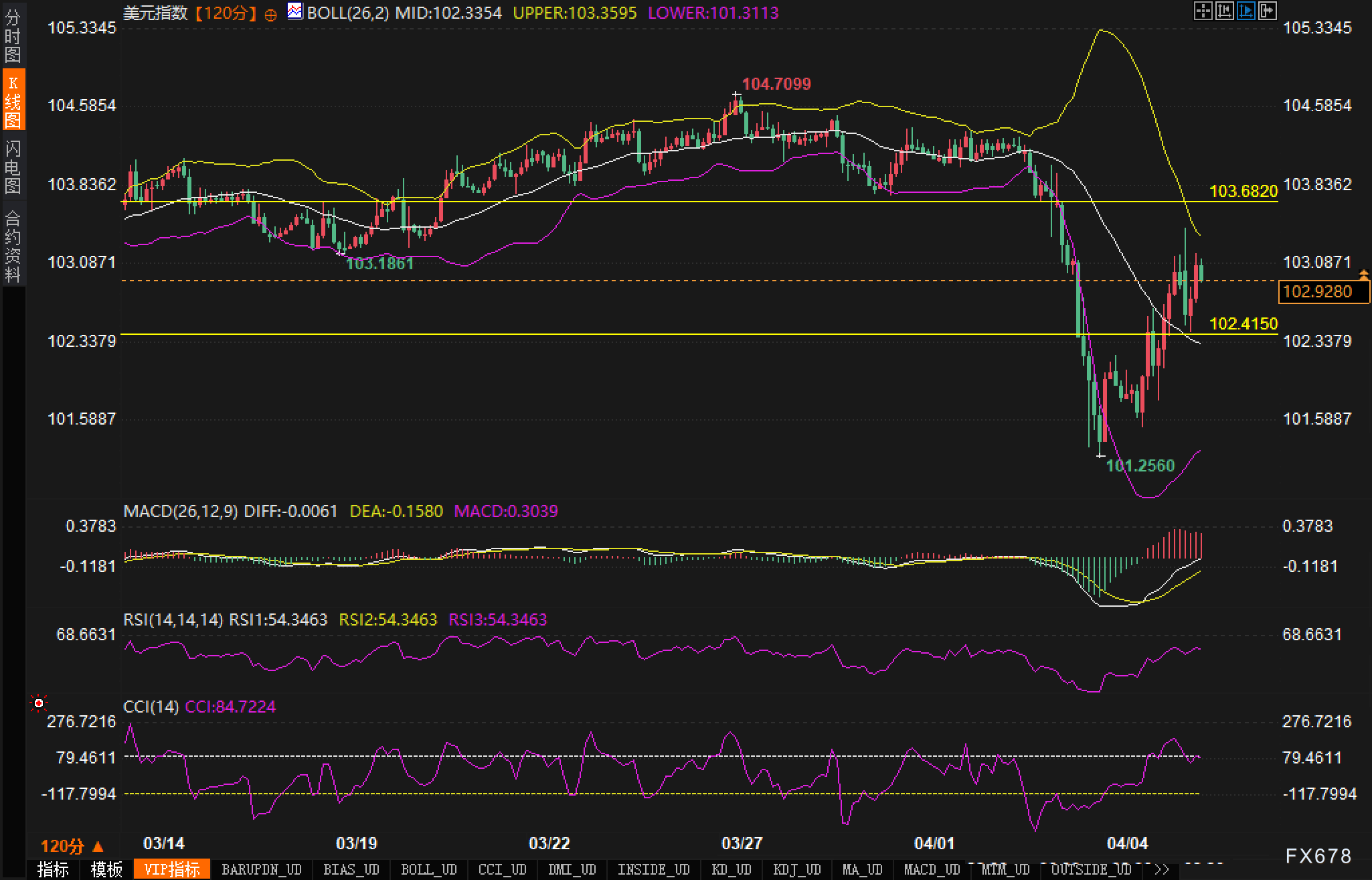 美元指数的120分钟图显示,近期价格走势呈现出了明显的下跌通道。布林带中轨与上轨逐渐向下拓展,表明空头压力持续增强。价格从104.7099的阻力位开始回落,并在短时间内跌破多条均线支撑,直至测试101.2560的低点,随后出现反弹。当前MACD指标显示,DIFF线与DEA线形成金叉,柱状图由负转正,可能预示短期动能出现改善。相对强弱指标(RSI)目前处于54.3463水平,从超卖区域回升,暗示下跌动能有所减弱。关键支撑位于102.8000和102.4150区域,如跌破将进一步确认空头主导格局。