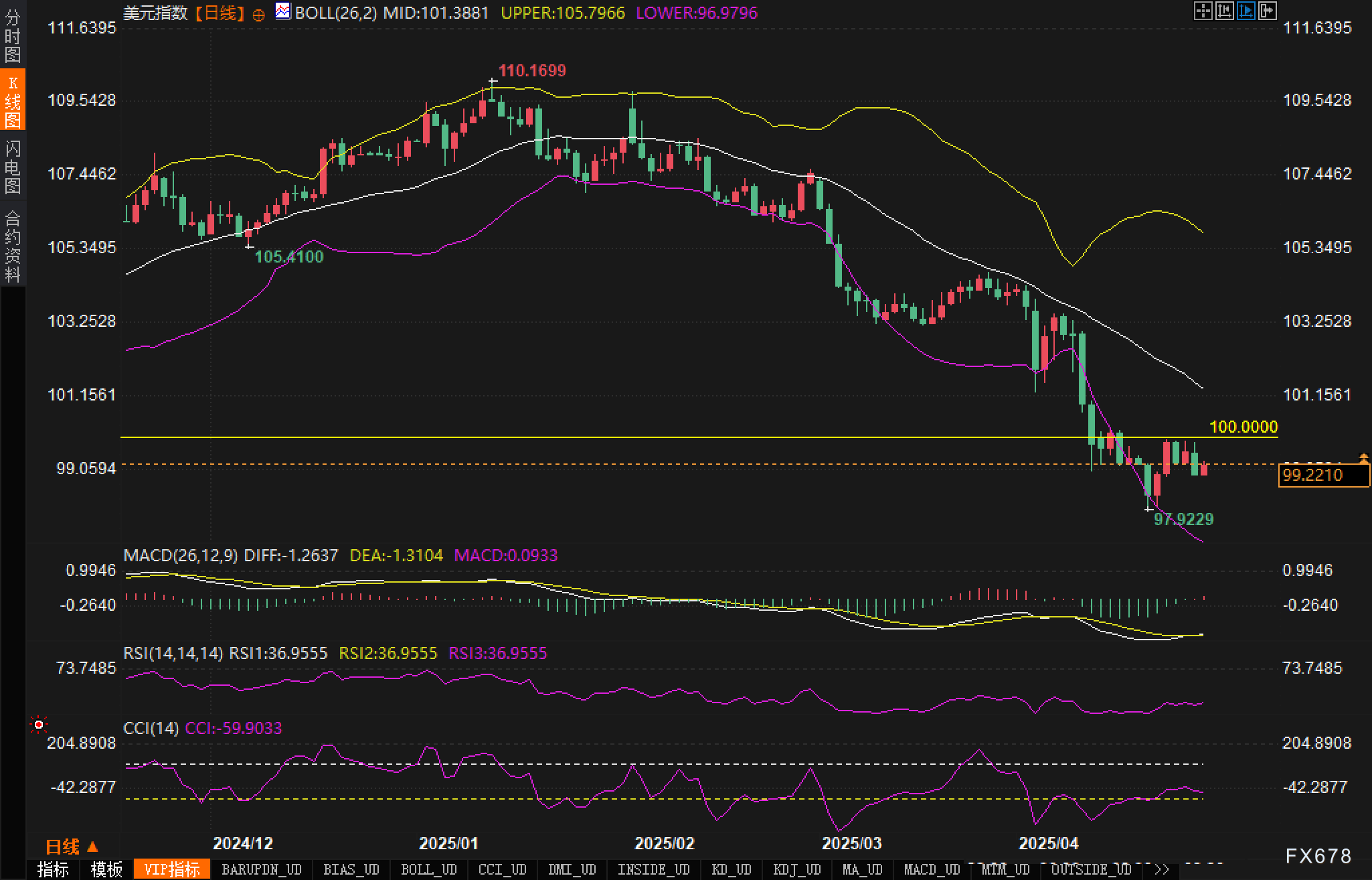 布林带指标显示中轨在101.3881,上轨在105.7966,下轨在96.9796。当前价格处于下轨附近,显示下行压力较大,但也预示可能出现技术性反弹。