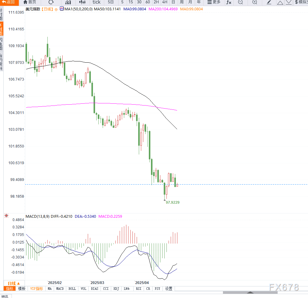 从日线走势来看,美元指数(DXY)在接连下挫后,目前处于99附近震荡整理,整体仍呈弱势格局。短期5日与10日均线继续下行,且死叉压制明显,反弹受限于99.40区域;20日均线由上行转为走平,表明中期趋势也在逐步转弱。