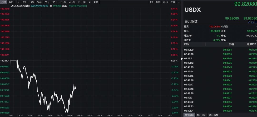 5月5日,美元指数盘中最低跌至99.60附近,最大跌幅超过0.43%。随后,美元指数跌幅有所收窄。
