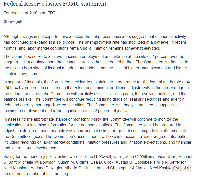为支持其目标,委员会决定将联邦基金利率目标区间维持在4.25%-4.5%。在考虑对联邦基金利率目标区间的进一步调整的程度和时机时,委员会将仔细评估新公布的数据、不断变化的前景和风险平衡。委员会将继续减少其持有的美国公债、机构债和机构抵押贷款支持证券(MBS)。委员会坚决致力于支持充分就业并使通胀回到2%的目标。