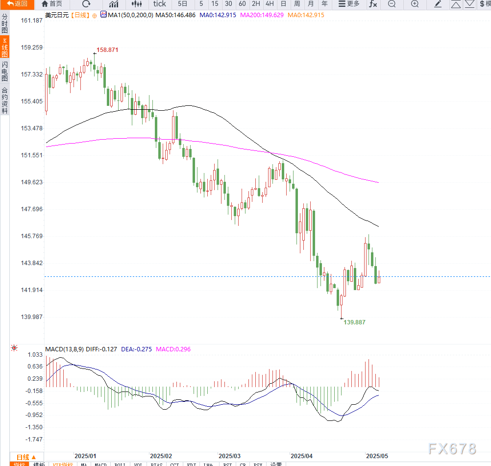 日元在周三亚洲时段走软,终结连续三日对美元升势。随着亚洲大国和美国即将在瑞士举行高层贸易磋商,全球市场风险情绪改善,投资者对传统避险资产如日元的需求减弱,使美元兑日元汇率稳步上扬,交投于143.00附近。