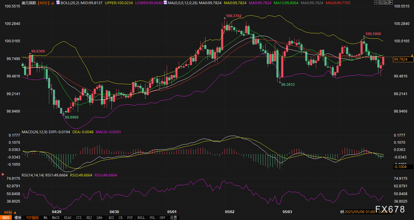 周二(5月6日),美元指数延续疲软态势。市场对贸易协议的乐观情绪消退,叠加新兴亚洲货币波动加剧,美元短期承压明显。美联储及英国央行政策会议临近,投资者交投趋于谨慎,技术面多空力量陷入僵持,盘面进入震荡整理阶段。以下结合60分钟与240分钟图技术指标及基本面动态,解析当前市场逻辑。