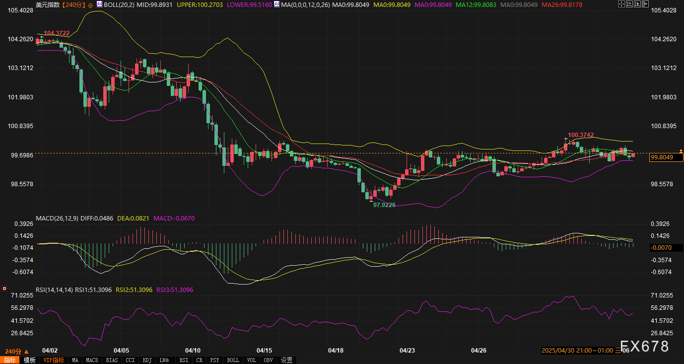 当前技术面显示空头略占优势,但未形成趋势性信号,日内或维持99.60-100.02区间震荡。