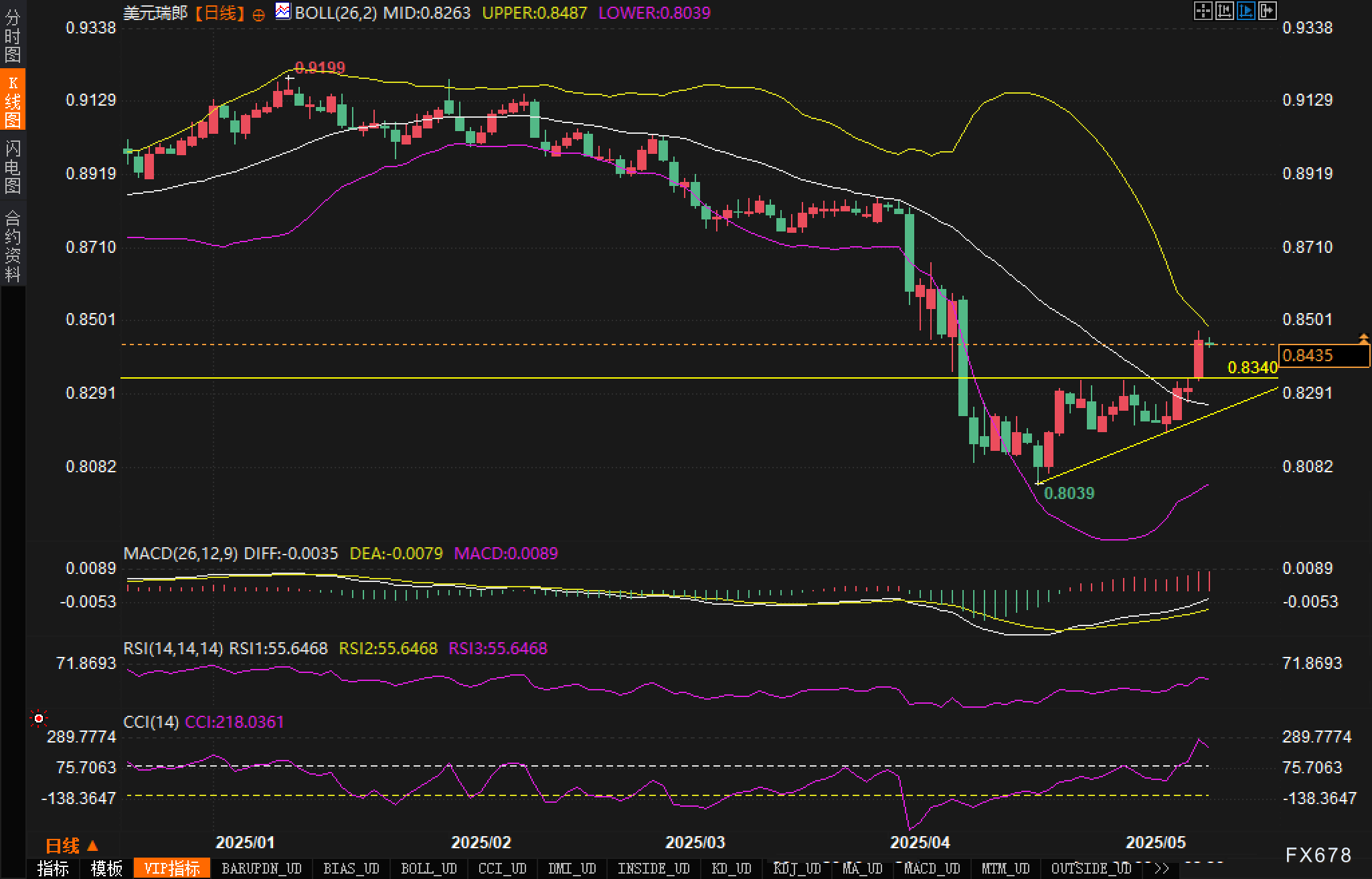 近期美元/瑞郎的大幅上涨主要受益于美中贸易谈判的进展。根据协议,美国将对中国商品的关税从145%降至30%,而中国将把对美国进口商品的关税从125%降至10%。