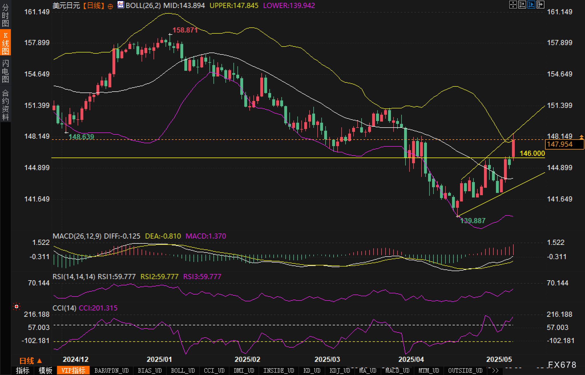 美元兑日元日线图显示,汇价近期走势呈现明显的V型反转形态。从图中可见,汇价在触及139.887的低点后开始筑底回升,随后突破下降趋势线压制,形成一个典型的突破回测确认形态。目前,汇价来到148关口,有效突破了布林带中轨及多条移动平均线的压制,显示短期上行动能强劲。