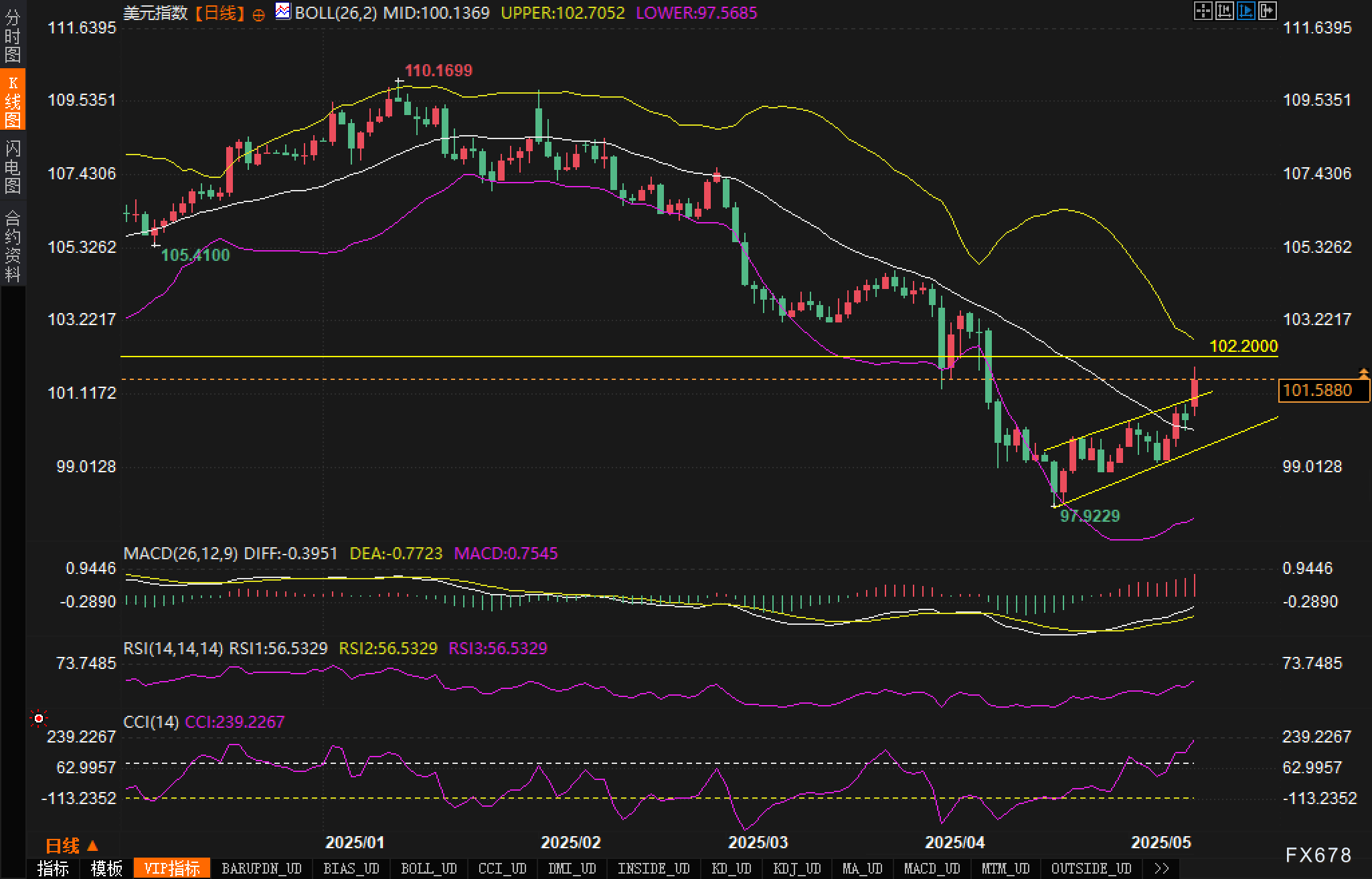 周一(5月12日),美元指数以罕见的强劲姿态重返101.60关口,打破了此前数周的盘整态势。这一波涨势源于中美宣布达成为期90天的贸易缓和协议,双方大幅下调相互关税,市场对此反应强烈,各类资产相关性重新显现。