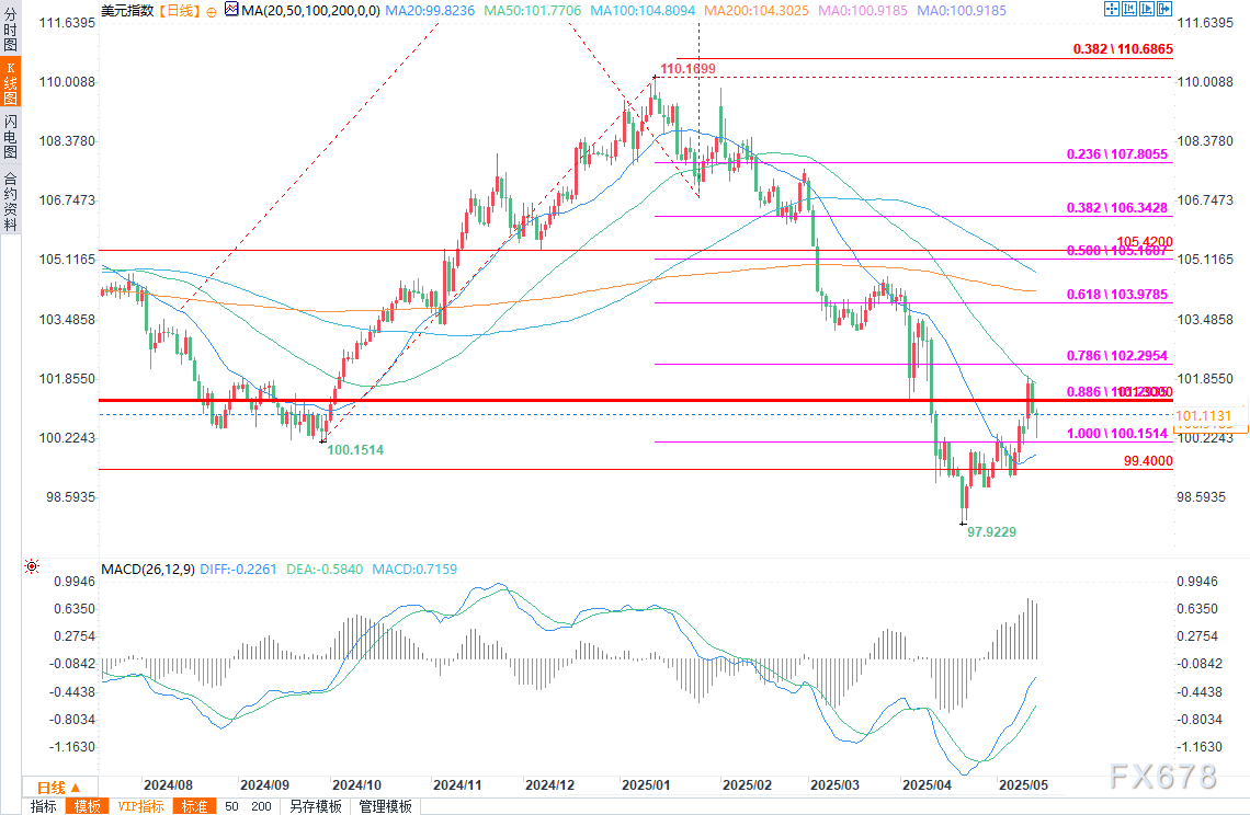 周三(5月14日)欧盘时段,美元指数(DXY)盘中跌至100.58,下跌0.40%。此前,投资者因低于预期的通胀数据和缓和的贸易紧张局势,重新调整了对美联储政策的预期。