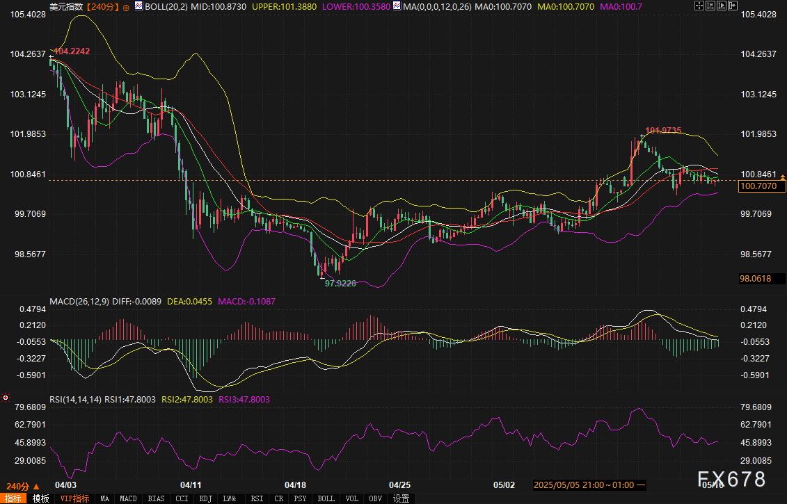4小时图显示,美元指数当前报价100.7114,位于布林带中轨(100.8716)下方,布林带上下轨分别为101.3884与100.3552,整体带宽较60分钟图更宽,隐含更大波动潜力。均线系统中,26周期均线(101.046)与12周期均线(100.7941)保持空头排列,且价格距离26周期均线较远,显示中周期压制明确。RSI指标(14周期)值为46.8131,低于60分钟图水平且更接近40-60中性区间下沿,进一步印证中周期弱势。