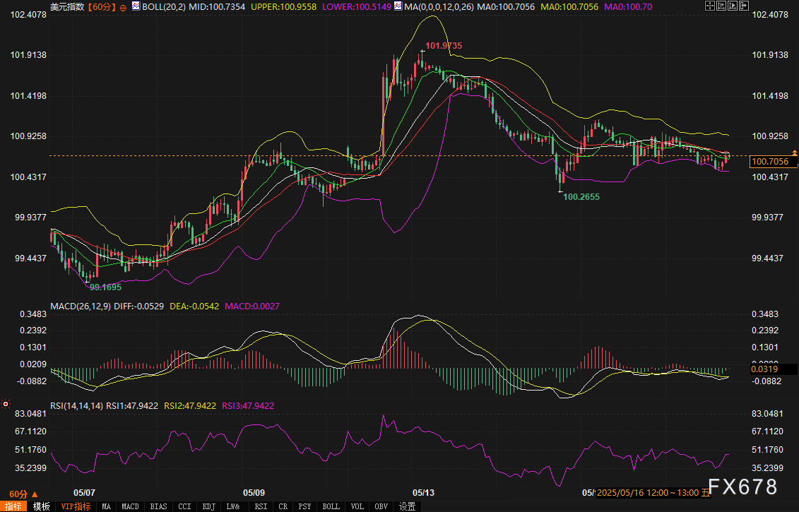 从60分钟级别看,美元指数当前运行于布林带中轨(100.7346)下方,日内报价100.7114,布林带上下轨分别为100.9557与100.5147,整体呈现收口形态,显示短期波动空间收窄。均线系统方面,26周期均线(100.7469)略高于12周期均线(100.6591),价格夹于两均线之间,表明多空力量尚未形成明确主导。RSI指标(14周期)值为47.5750,接近50中性线但略偏下方,反映市场情绪偏向谨慎看空。