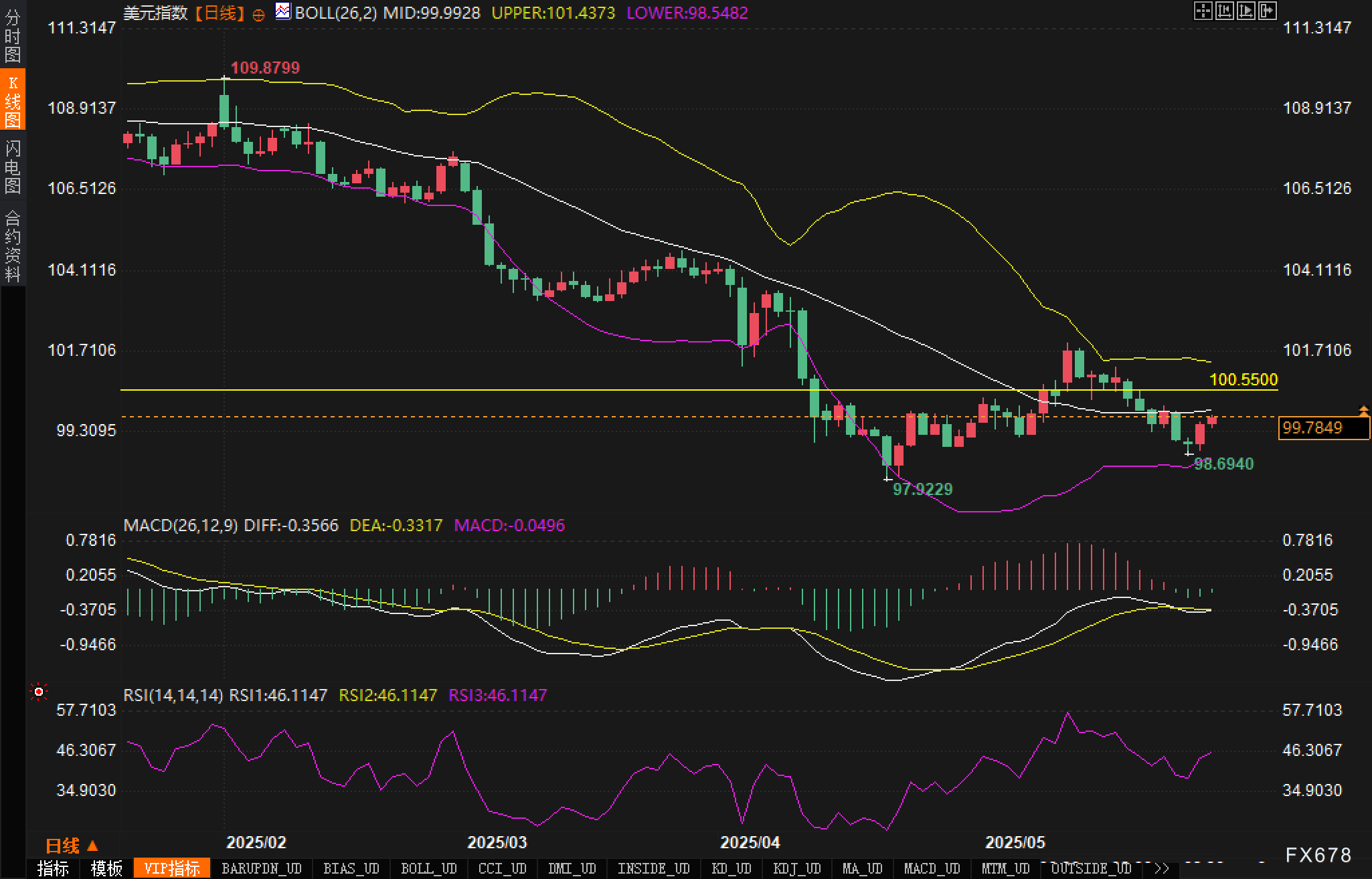 美元指数日线图显示,价格在触及98.69的低点后展开反弹,目前正测试100.5500的关键阻力位。布林带显示,价格正在向中轨99.9928靠拢,上轨位于101.4373,下轨位于98.5482。若能有效突破100.5500阻力,后市有望进一步上探101.4373的布林上轨位置。