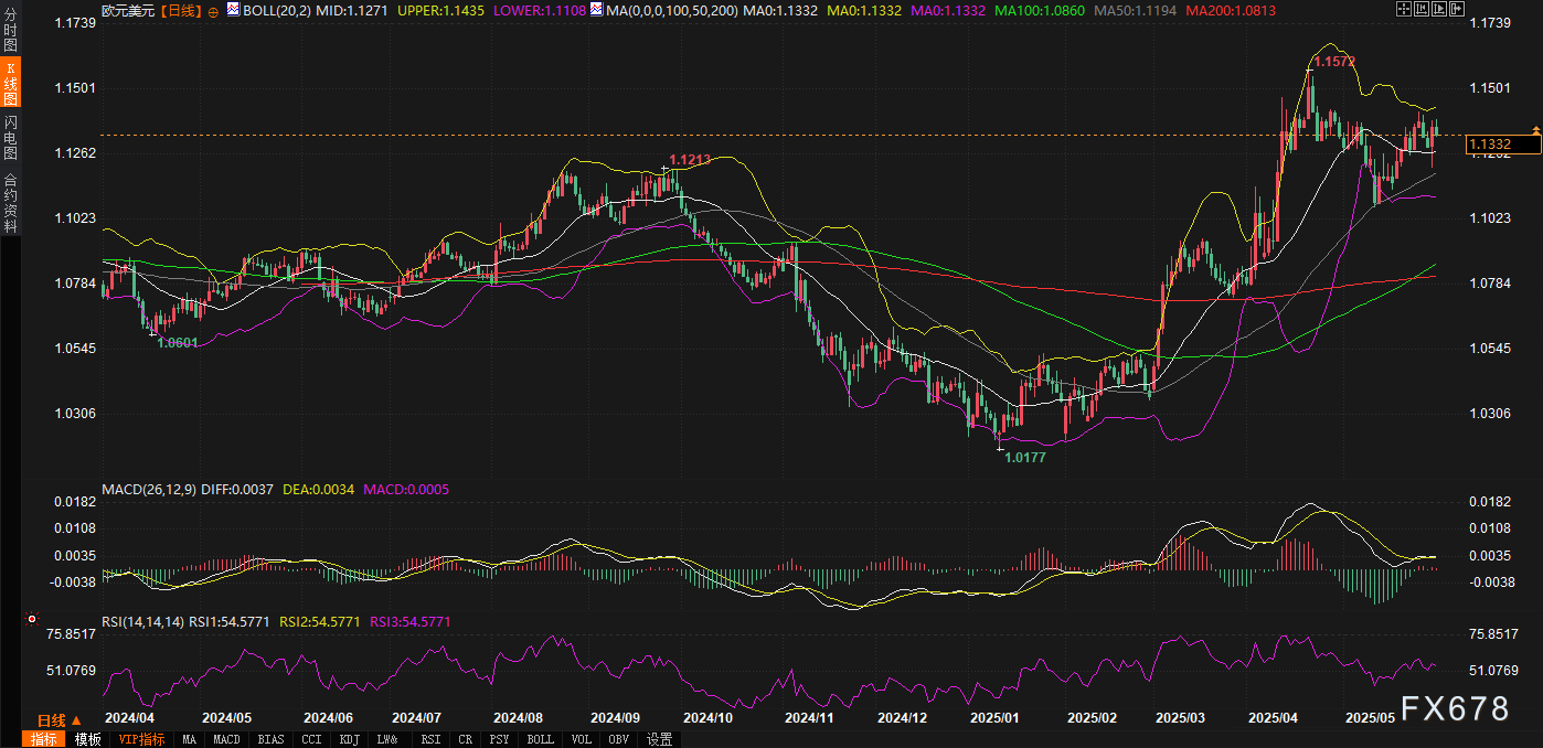 从技术面看,欧元兑美元的走势在近期呈现出高波动性但缺乏持续突破的特征。日线图上,欧元当前报价1.1331,位于布林带中轨1.1271上方,距离上轨1.1435仍有一定空间。布林带显示,当前市场波动区间在1.1108至1.1435之间,短期内欧元可能继续在这一区间内震荡。MACD指标方面,DIFF线(0.0037)略高于DEA线(0.0034),MACD值为0.0004,表明多头动能略占上风,但整体动能偏弱,未能形成明确的趋势信号。RSI指标为54.2174,处于中性区域,显示市场情绪较为平衡,缺乏明显的超买或超卖压力。