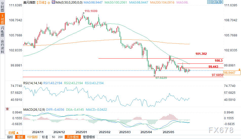 周一(6月9日),美元指数(DXY)小幅下跌,从周五的反弹高点回落,但仍高于98.351和97.921关键技术支撑位。这一温和下跌反映出美元动能的暂时休整,市场在中美贸易谈判于伦敦开启前转为谨慎。