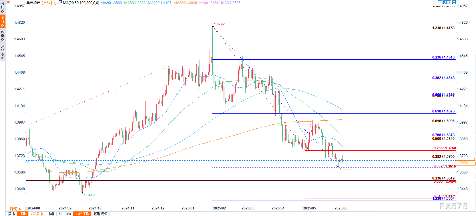 (美元/加元日图 来源:易汇通 ,蓝色线条:从年内高点到低点 紫色线条:去年低点到去年高点)