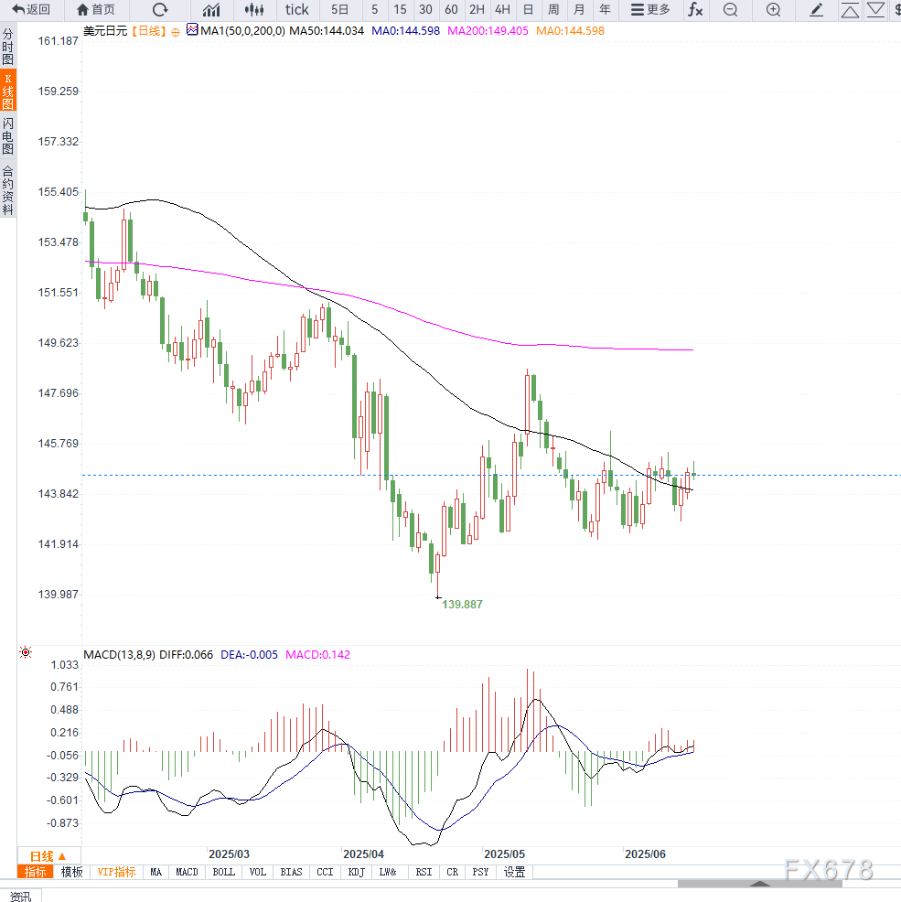 技术上看,USD/JPY在145.00心理关口附近遭遇阻力。若持续突破并稳固于其上方,将形成多周整理区间的上行突破,短线或挑战145.45(本月高点),并进一步指向146.00整数位,甚至是146.25-146.30区域(5月29日高点)。