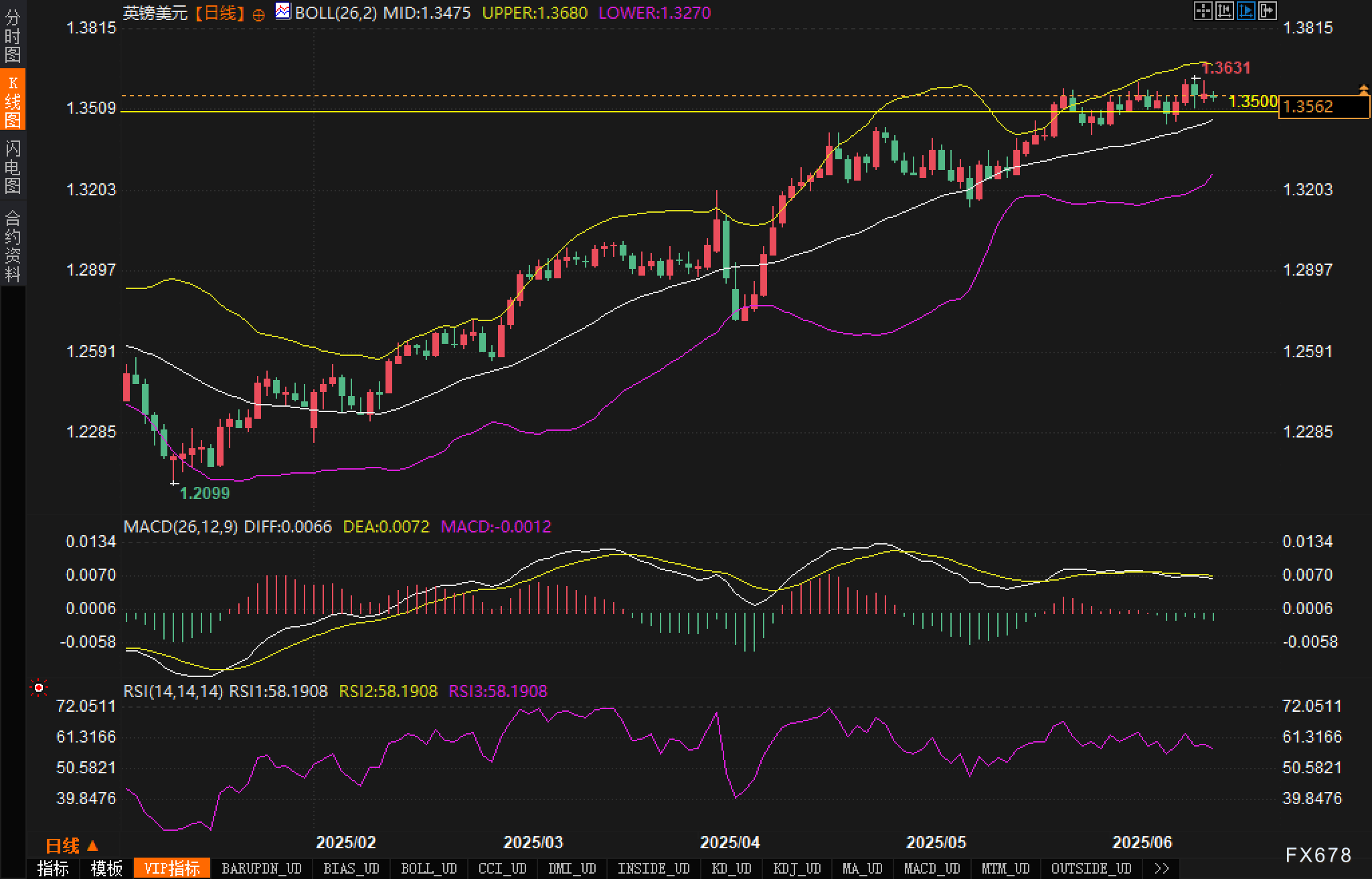 从图表来看,英镑兑美元当前处于上升趋势中,但多头动能已有明显减弱迹象。布林带呈现出收口态势,布林中轨位于1.3475,汇价目前运行于中轨之上、上轨(1.3680)之下,显示当前波动率有所下降,市场进入短期整理阶段。
