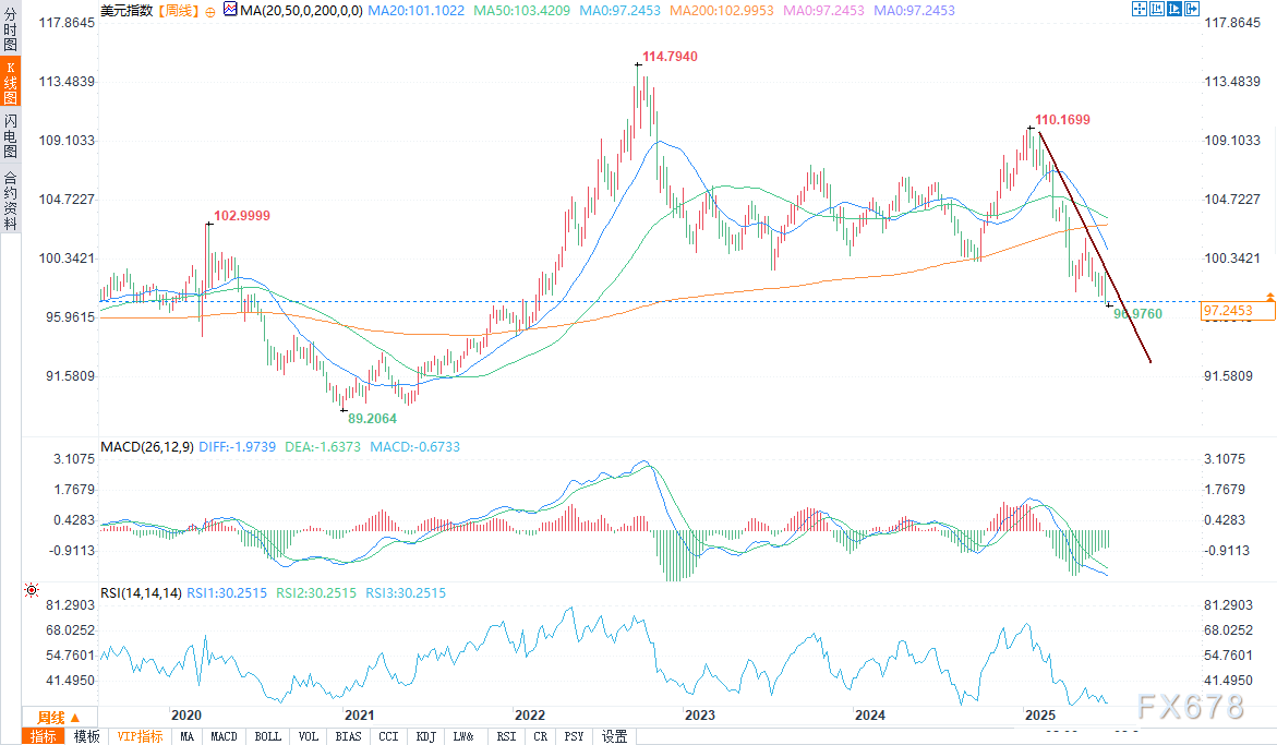 自美国宣布对等关税税率以来,美元指数一直承受持续压力,在周线图的整体下跌趋势中接连创出更低的高点和更低的低点。随着第二季度最后一周出现看跌关键反转 K线,导致美元指数跌破97.70的支撑位,这表明美元在下半年初期可能进一步下跌。