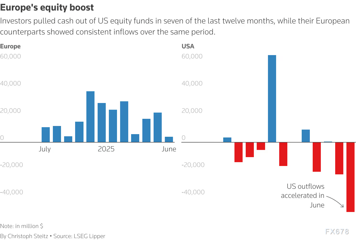 相比之下,欧洲市场以其相对稳定的政策框架和持续推动的基础设施投资,吸引了全球投资者的目光。欧洲央行总行长拉加德近期表示,市场力量和投资者的信心正在向欧洲倾斜。数据显示,2025年至今,流入欧洲股票基金的资金已超过1000亿美元,同比增长三倍,而美国市场同期资金流出规模则激增至870亿美元,较去年翻倍。这股资金流向的逆转,凸显了投资者对欧洲市场信心的显著增强。