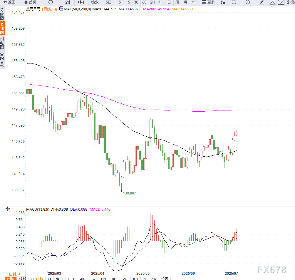周三亚洲时段,日元继续走弱,美元兑日元突破147关口,触及两周新高。投资者对美国总统特朗普宣布自8月1日起对日本商品征收25%关税的影响深感担忧,普遍预计这将拖累日本经济表现,迫使日本央行全年不再加息。
