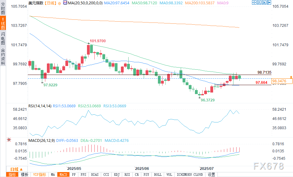 从技术面看,美元指数仍受制于下行的50日均线,多次尝试突破近期高点均告失败。除非美元指数能明确收于6月末高点99.421上方,否则上行动能仍将受限。