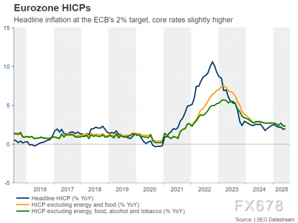 (欧元区消费者物价指数(HICP)的年度同比变化情况。总体通胀接近欧洲央行2%的目标,核心通胀率略高。)