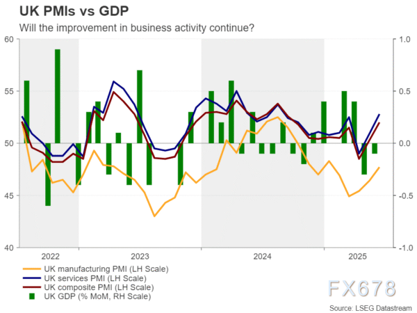 (2022年到2025年英国采购经理人指数(PMIs)与国内生产总值(GDP)的对比情况)