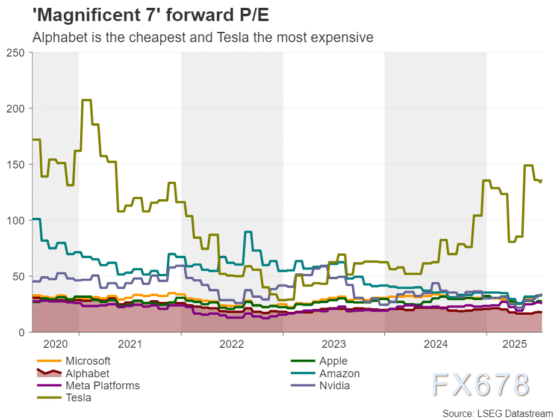 (Magnificent7科技公司在2020年至2025年的前瞻市盈率变化)