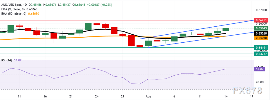 周四(8月14日)亚洲时段,在国内劳动力市场数据公布后,澳元一度延续过去两个交易日涨势,最高触及0.6568,涨幅约0.37%,目前回落至0.6549附近。随着美联储进一步降息的可能性上升,美元贬值,澳元兑美元货币对也获得了支撑。