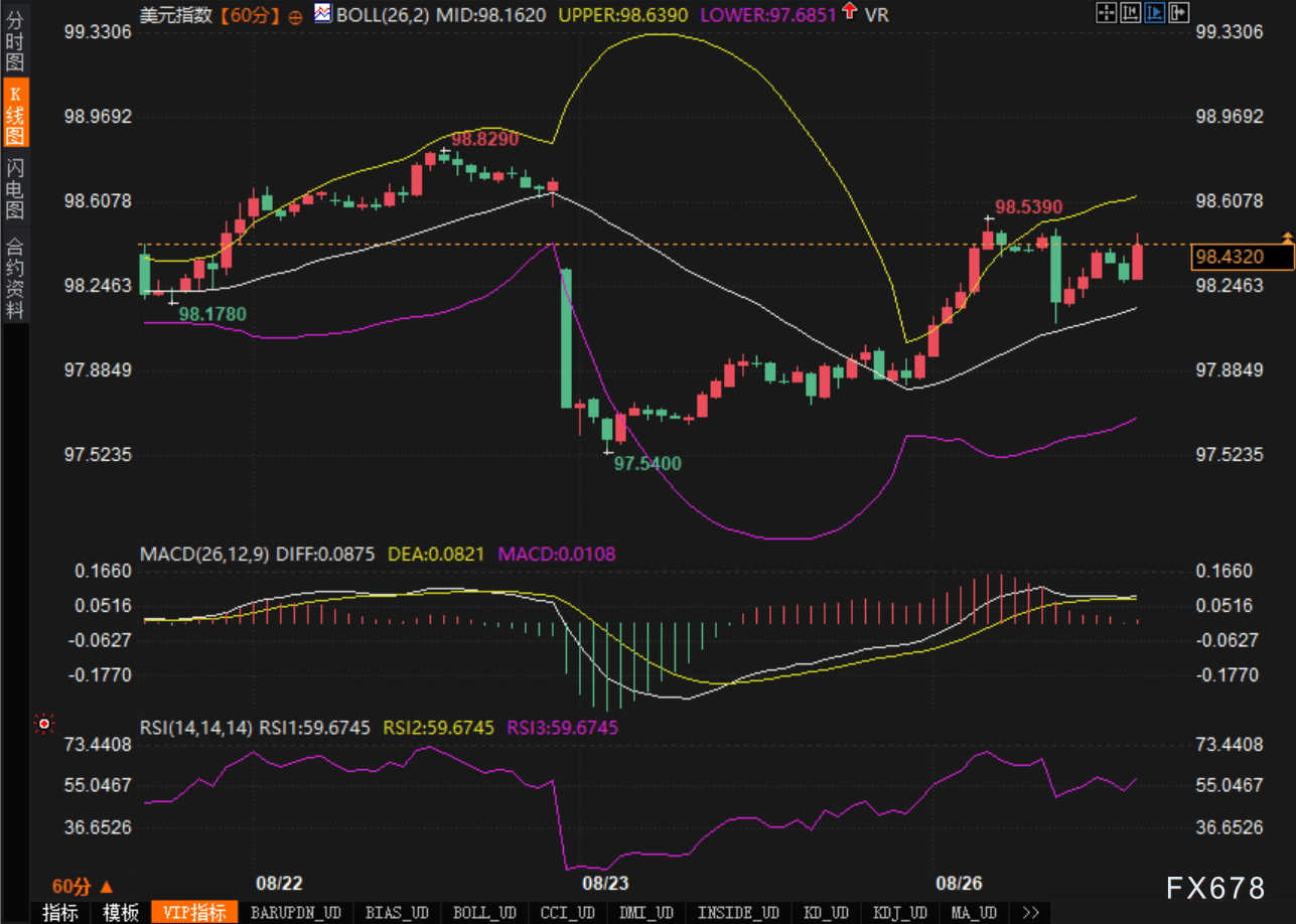 美元指数近期表现波动,市场的关注点集中在美国经济数据的发布以及美联储的政策调整。周二(8月26日)欧洲早盘时段美元指数维持在98.40附近,技术面和基本面的交织影响下,市场情绪复杂。最新的经济数据和政治事件,尤其是关于美联储高官的去留问题,使得美元短期内难以获得明显的方向性突破。